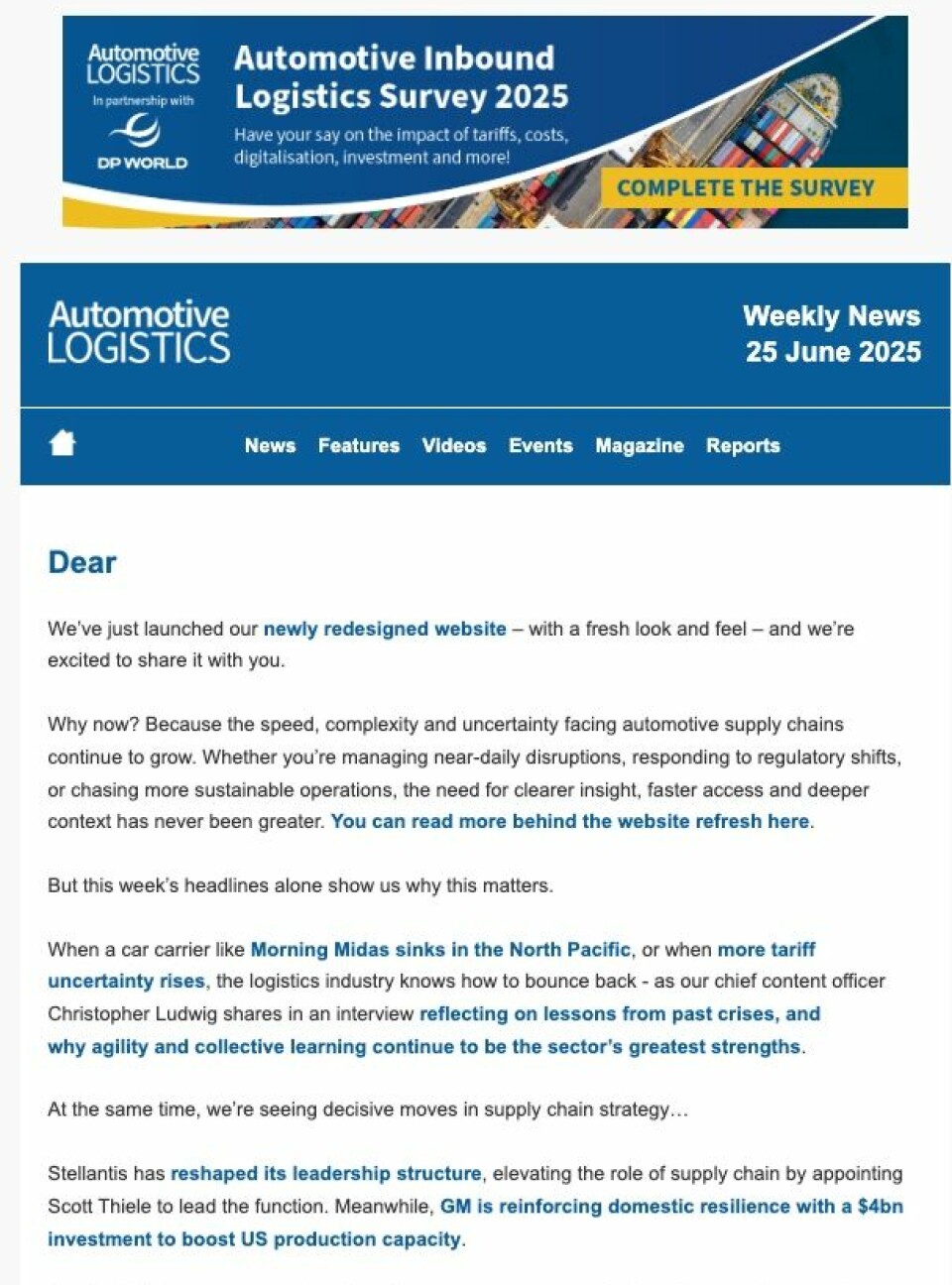 Delivered weekly to your inbox, the Automotive Logistics newsletter will include: